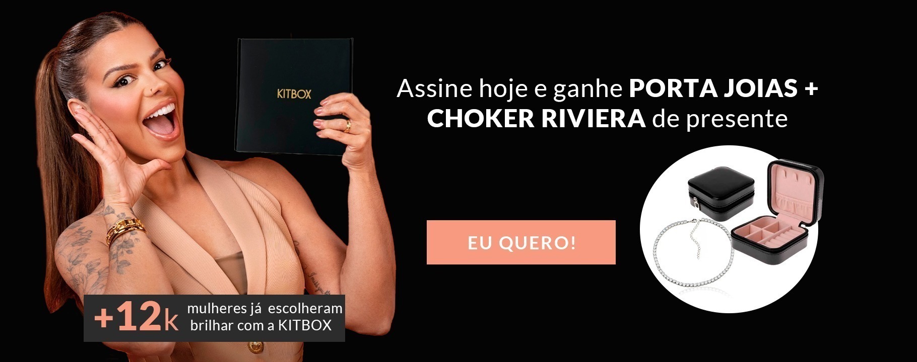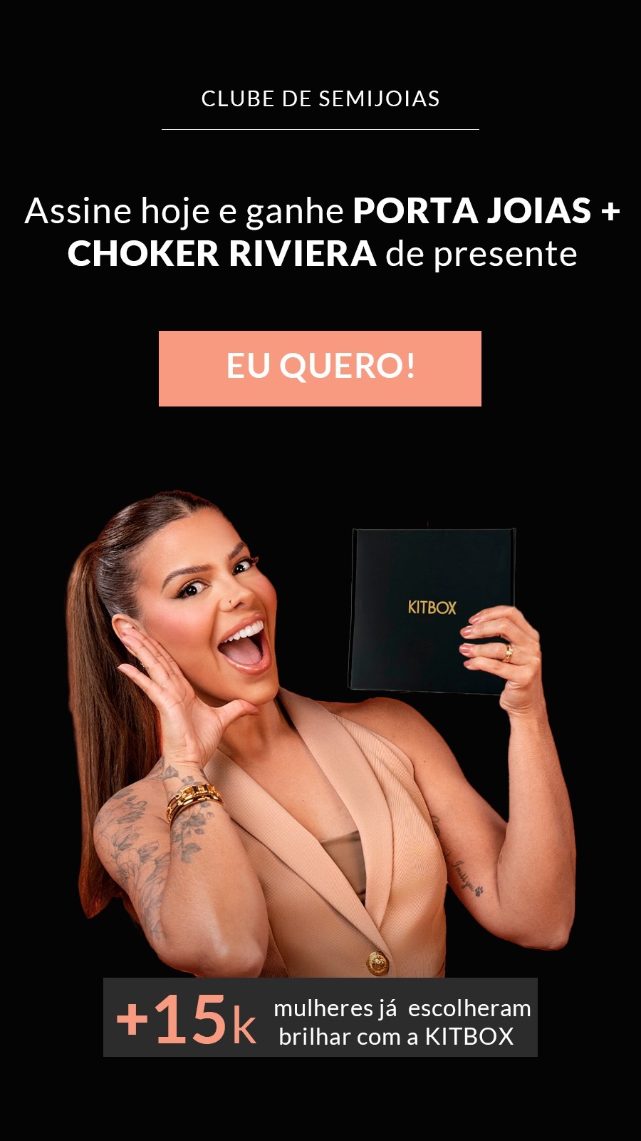 Na KITBOX você recebe semijoias de alta qualidade com garantia de 6 meses e tecnologia antialérgica banhadas em ouro 18k, ouro branco e ródio negro que valem até 5x mais que o valor pago no plano contratado.