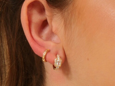 Kit argolinha com pedra retangular cristal e argolinha cravejada banhada em ouro 18k