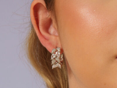 Argolinha folhas com pedras cristais e cravejadas banhado em ouro branco