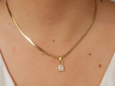 Colar fita com pingente retangular cristal banhado em ouro 18k