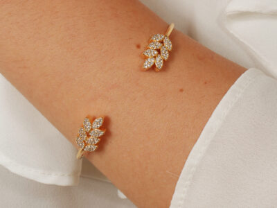 Bracelete aro com ramo de folhas cravejado banhado em ouro 18k