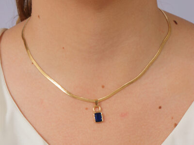 Colar fita com pingente retangular na cor azul safira, banhado...26ago