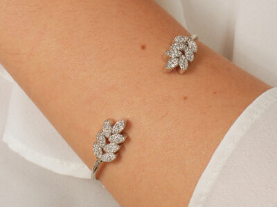 Bracelete aro com ramo de folhas cravejado banhado em ouro branco