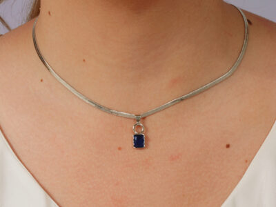 Colar fita com pingente retangular azul safira banhado em ouro branco
