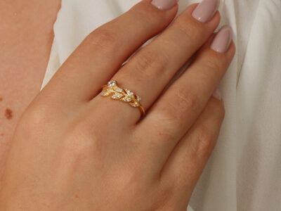 Anel ramo de folhas cravejado banhado em ouro 18k