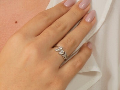 Anel em formato de ramo de folhas cravejadas, banhado em ouro branco,...26ago