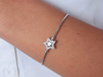 Bracelete aro com duas ponta estrela cravejda e lisa banhado em ouro branco