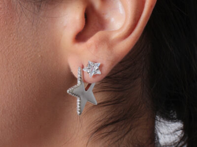 Kit de brincos argola estrela lisa com detalhes cravejado e ponto de luz estrela cristal banhado em ouro branco