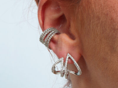 Kit de brincos designer dois triângulos cravejadas com piercing fake quatro fios banhado em ouro branco