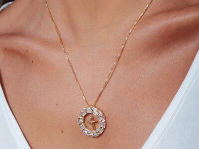 Colar com Pingente tipo mandala com cruz e cravação de pedras de zircônia