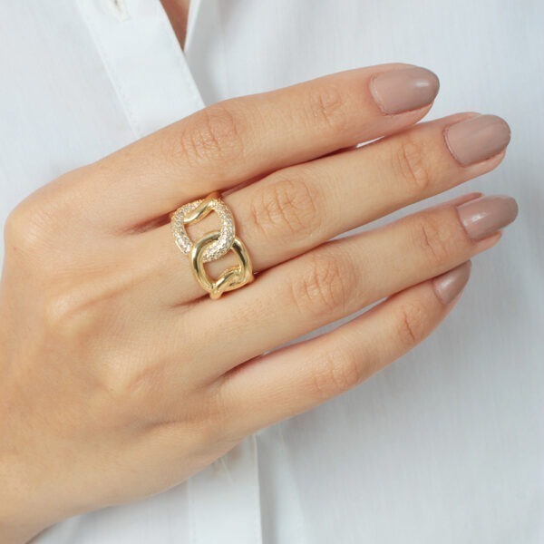 Anel estilo corrente vazado elo cravejado e liso banhado em ouro 18k