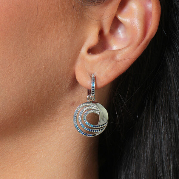 Argolinha cravejada com pingente circular vazado cravejado de zircônias azuis