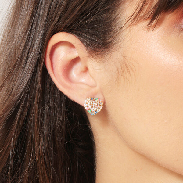 Brinco de coração cravejado de zircônias cristal e coloridas