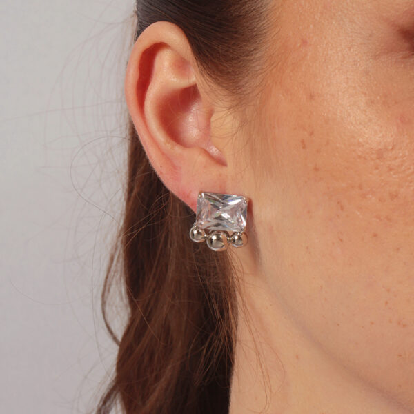 Brinco de zircônia cristal retangular com detalhes banhado em ouro branco