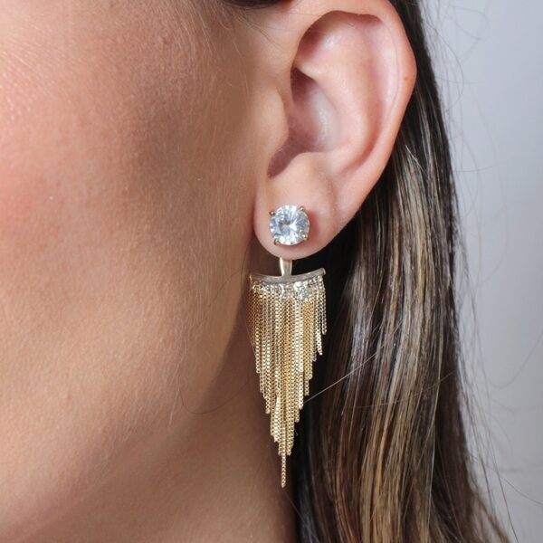 Brinco ear jacket de franja com ponto de luz banhado em ouro 18k
