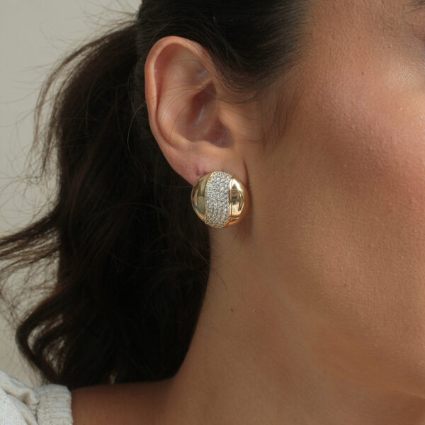 Brinco meia bola com fileiras de microzircônias cravejada banhado em ouro 18k