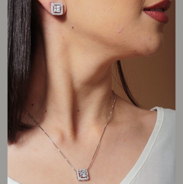 Conjunto colar e brinco quadrado de zircônia cristal cravejado banhado em ouro branco