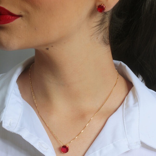 Conjunto de zircônia redondo cor rubi banhado em ouro 18k