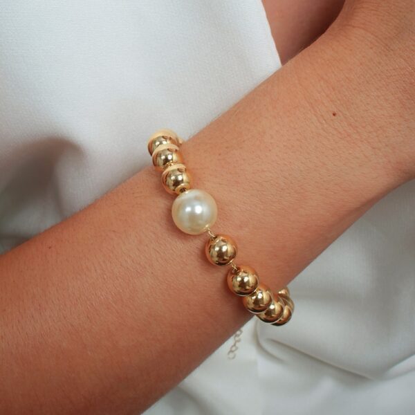 Pulseira de bolas lisas com detalhe de peróla no meio banhado em ouro 18k